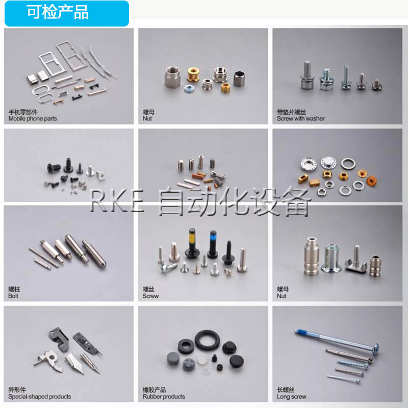 2、檢測(cè)的范圍:螺絲、螺母、汽車配件、手機(jī)零配件、航空件、塑膠件、磁芯產(chǎn)品、表面缺陷、外觀尺寸、連接器、沖壓件、字符等等,都是可以進(jìn)行檢測(cè)篩選的。
