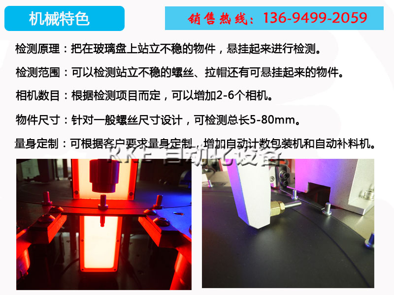 分度盤篩選設(shè)備檢測螺柱,把在玻璃盤上站立不穩(wěn)的物件,懸掛起來進行檢測。檢測范圍廣,速度快,精度高